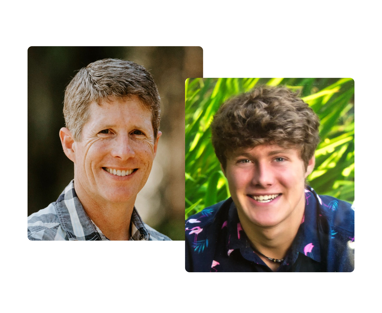 Chuck Ross (left) and Gavin Ross (right) here! As a father-son duo, we've been spreading positivity for generations.